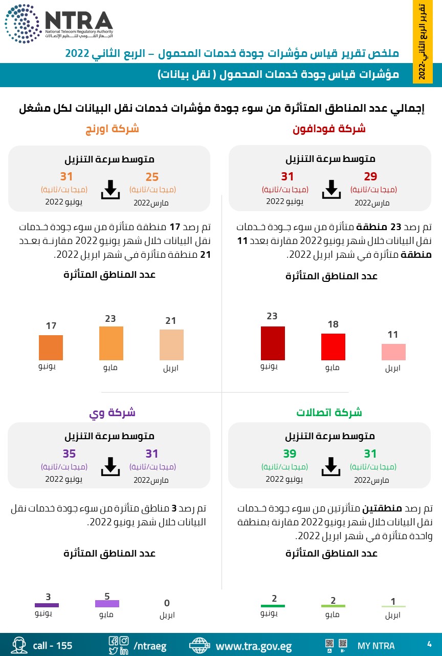 كما رصد التقرير تحسنا في متوسط عدد المناطق المتأثرة بجودة خدمات نقل البيانات في الربع الثاني لعام 2022، حيث انخفض متوسط عدد المناطق المتأثرة بنسبة 35% مقارنة بالربع الأول 2022.