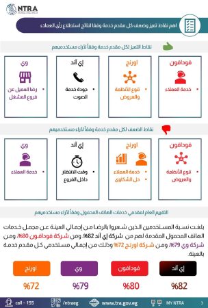 – خدمة العملاء: حصلت شركتا فودافون وإي آند على نسبة 80% بمؤشر خدمة العملاء، تليها شركة وي بنسبة 79%، وشركة اورنج بنسبة 68%.