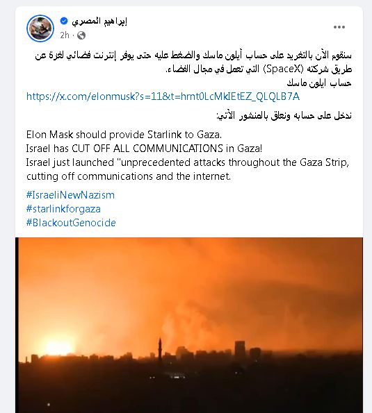 دعا العديد من مستخدمي شبكات التواصل الاجتماعي، وفي مقدمتها فيسبوك وإكس، للضغط على رجل الأعمال الأمريكي إيلون ماسك، من أجل توفير خدمة تغطية الإنترنت الفضائي “ستارلينك” لسكان قطاع غزة، وسط معاناتهم من الهجوم الإسرائيلي على القطاع، وتعرض الاتصالات الهاتفية وخدمات الإنترنت إلى الانقطاع.
